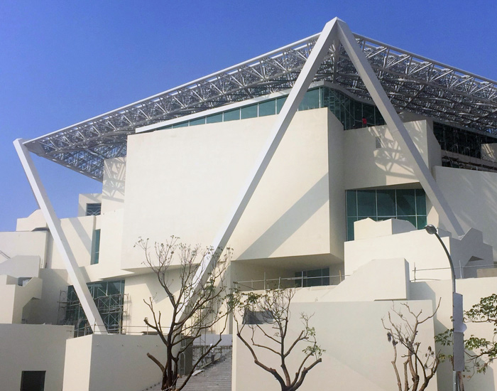 inspired by the flower of the official tree of tainan city, the canopy shelters five-storeys of stacked volumes that contain the exhibition spaces.