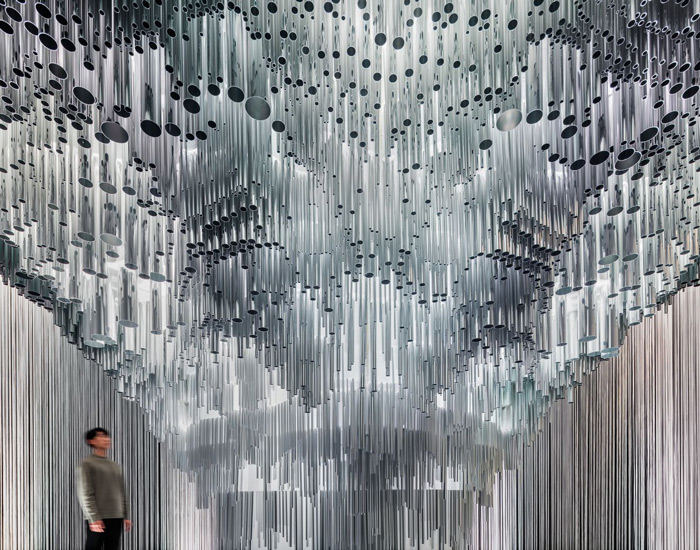 hansmeyer created an intricate geometric algorithm to apply on a total of 15,000 extruded aluminum tubes and 300,000 tiles.