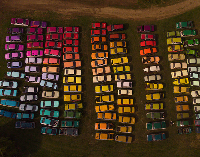The post zoer paints over 144 wrecked cars to create a large-scale color chart appeared first on designboom | architecture & design magazine.