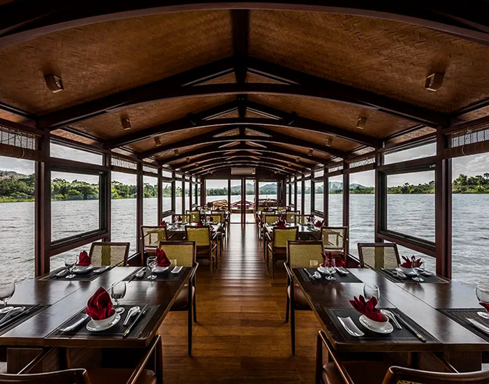 NAMBINH SHIP like a leaf on the river, in harmony with the surrounding landscape of Hue City, Vietnam