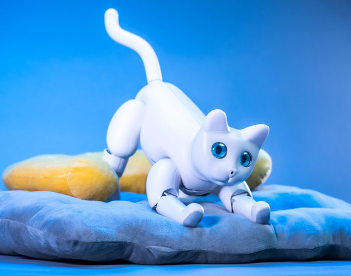 the robot cat autonomously moves using its 16 motorized joints and recognizes 20 keywords including 'come here'.
