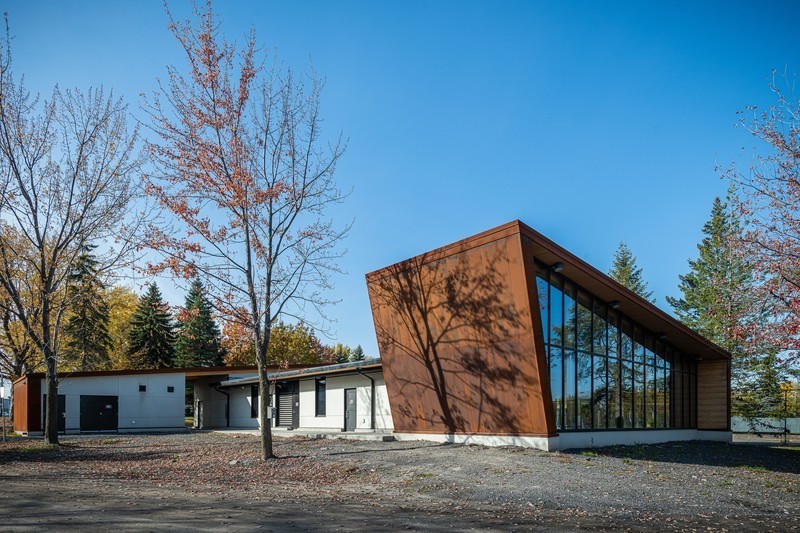 The Clémentine-de-la-Rousselière’s pavilion, finished in 2019, is implanted in a park of the Rivière-des-Prairies/Pointe-aux-Trembles’s district, on the tip of the east island of Montreal. This park is bordered on one side by the St-Lawrence river and on the other by the Notre Dame street, which is a one of the main road crossing the island from East to West.