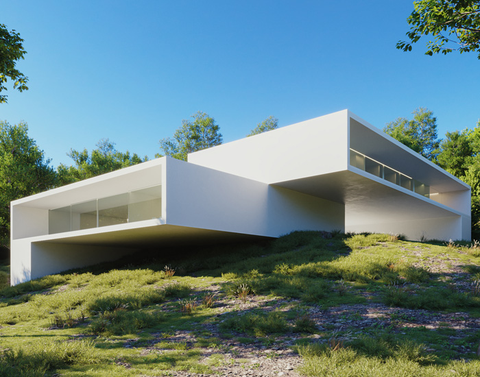 the two volumes are arranged differently to offer varying views of the surrounding landscape.