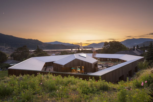 Es ist eine dramatische Landschaft: Umschlossen von der Felsenschlucht des Columbia River Gorge liegt das Boutique Hotel auf einem ehemaligen Schulcampus von 1937. Der vom Portlander Architekturbüro Waechter Architecture fertiggestellte Holzbau liegt eine Fahrtstunde von der Stadt in Oregon entfernt, in der City Bingen, US-Bundesstaat Washington. Neue Hotelkabinen verbunden mit einem überdachten Gehweg, ein Spa-Bereich und ein unterirdischer Veranstaltungsbereich befinden sich nun auf dem rund 2.5 Hektar großen Grundstück. Das zentrale Element des Hotelkomplexes ist der Ring aus zwanzig Wohnkabinen mit hellen Lamellen aus Zedernholz. Zwischen den Kabinen befinden sich mehrere überdachte Terrassen, die sowohl für Hotelbesucher*innen als auch für die Nachbarschaft zugänglich sind. Dabei ist der Kabinenring an sich als eine räumliche Abgrenzung zwischen dem Hotel und der benachbarten Wohnhäuser konzipiert worden. Die einstöckige Neubaustruktur folgt der Topografie des Ortes und soll angesichts seiner Größe nicht wie eine massive Barriere wirken. In der Mitte erhebt sich der Spa-Bereich mit Innen- und Außenbecken, einer Sauna und einem Café. Dieses teilweise offene Volumen verfügt über...