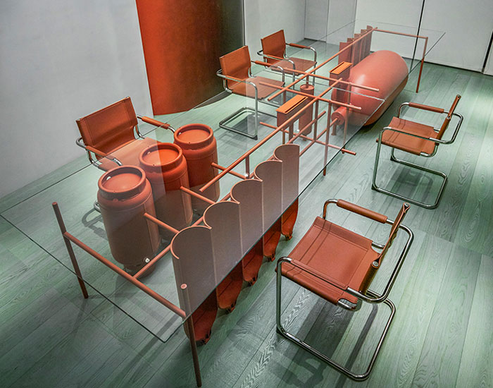 orange has been applied to the repurposed gas cylinders and pipes to represent the color of laboratory buttons.