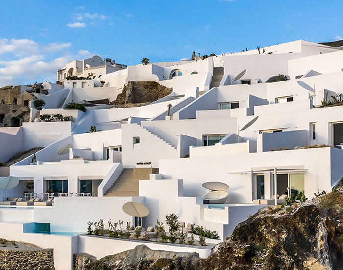 the new hotel complex folds into the natural contours of santorini's caldera landscape.