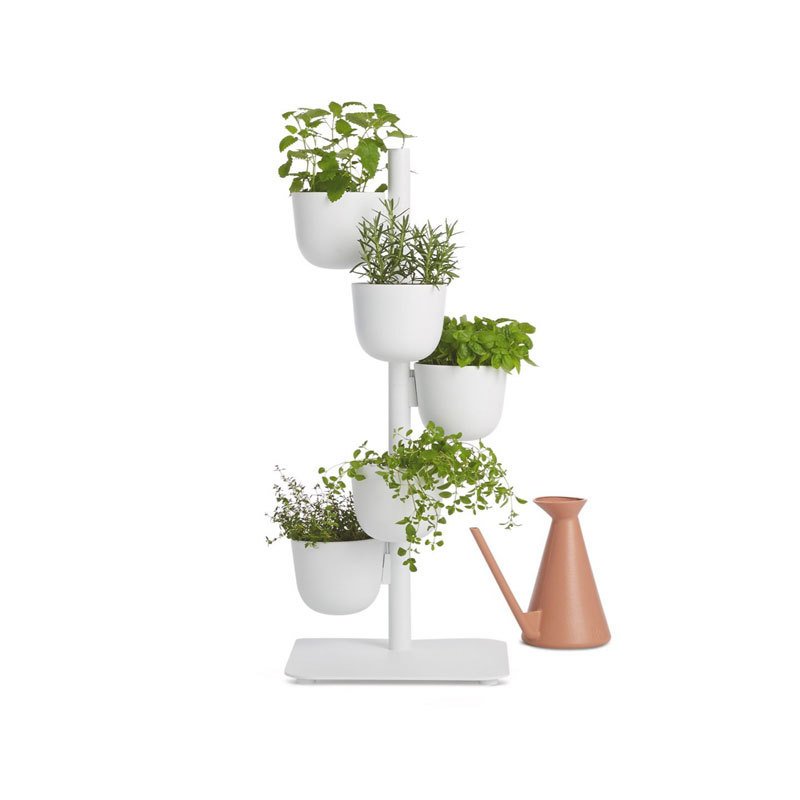Fascinated by how spaces transform over time, Hung-Ming Chen and Chen-Yen Wei invented the word Afteroom to name their Stockholm studio. "We simply want to create things people won’t get rid of," says Chen-Yen. In creating the Story Planter (2020), they brought a new twist to floral arrangements by accommodating plants and flowers in a vertical stack within a very compact footprint. "It was not an easy task, though it appears really simple," says Hung-Ming. "We hope people see it as a quiet, functional sculpture." All-metal construction and a heavy weighted base provide strength and stability. Bowls can be set facing forward or to the side. They do not have drainage holes. Made in Taiwan.