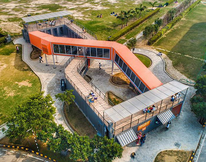 The post RJDL builds cafe infinity from recycled shipping containers in india appeared first on designboom | architecture & design magazine.