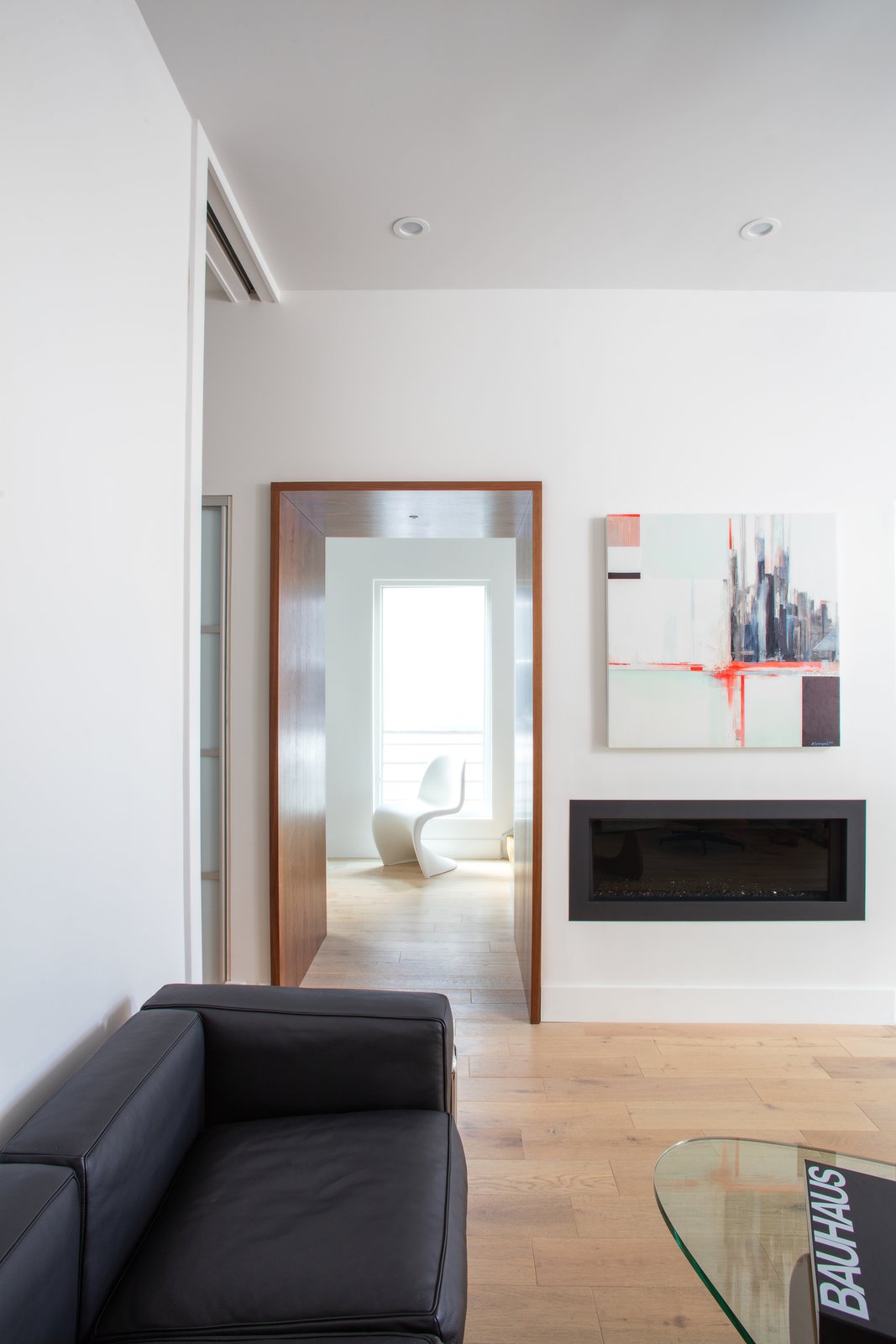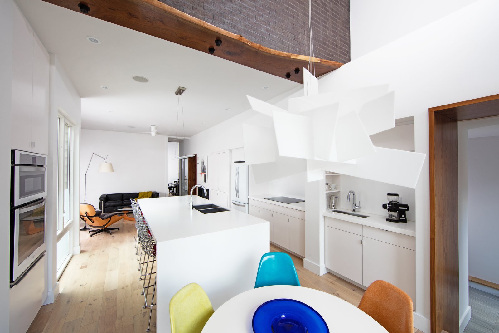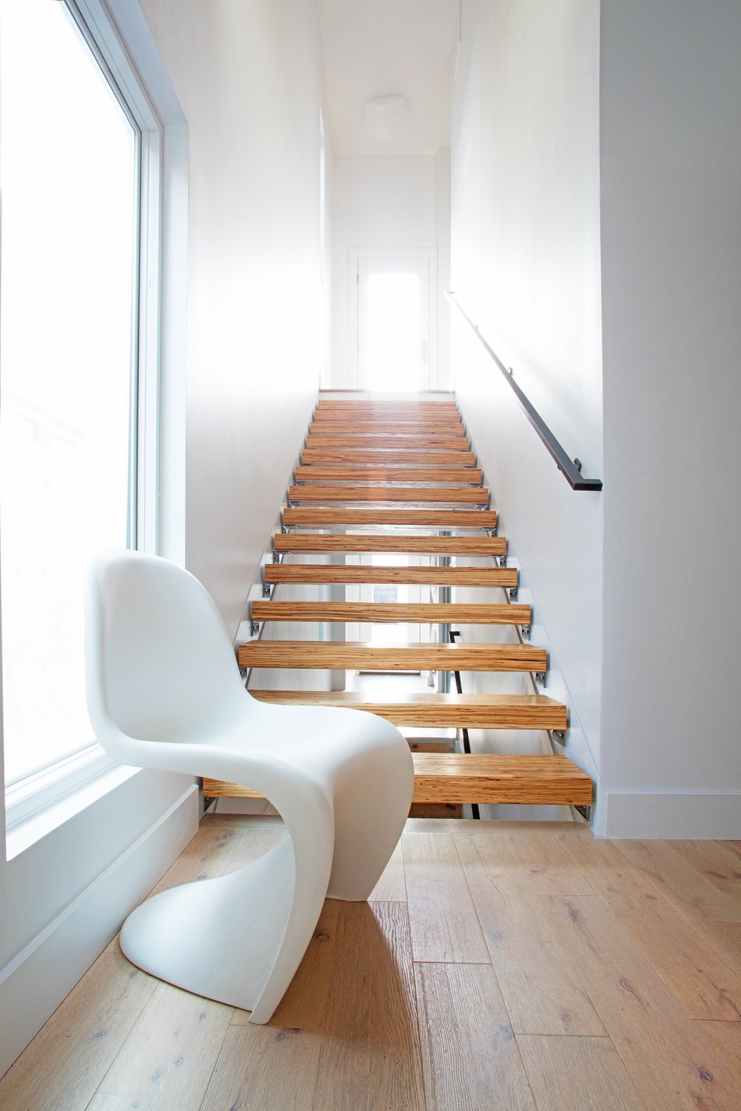 Some of the exterior masonry is continued inside, a visual contrast to the white living room and kitchen. Up an open riser stair with raw steel angles and sealed timber-strand wood beam treads, the owner’s suite perches on the second level. A finished basement level also holds another bedroom, bath, a media room, and storage.