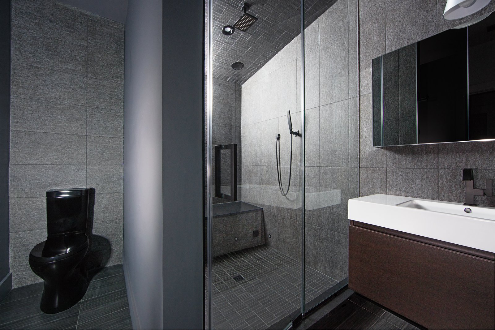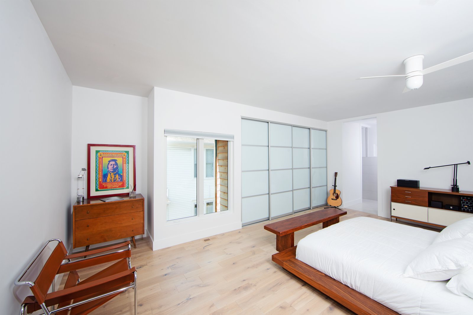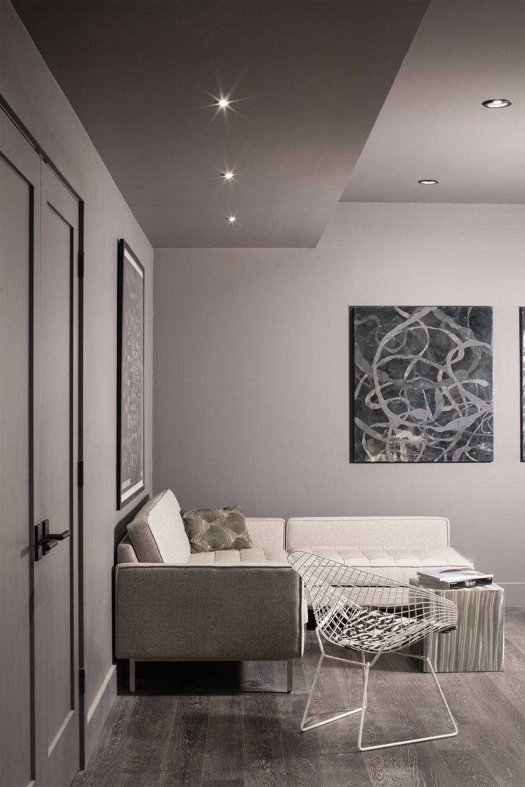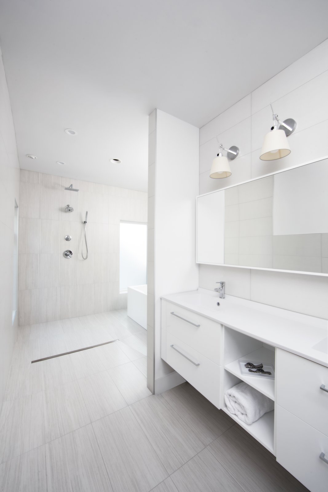 Some of the exterior masonry is continued inside, a visual contrast to the white living room and kitchen. Up an open riser stair with raw steel angles and sealed timber-strand wood beam treads, the owner’s suite perches on the second level. A finished basement level also holds another bedroom, bath, a media room, and storage.