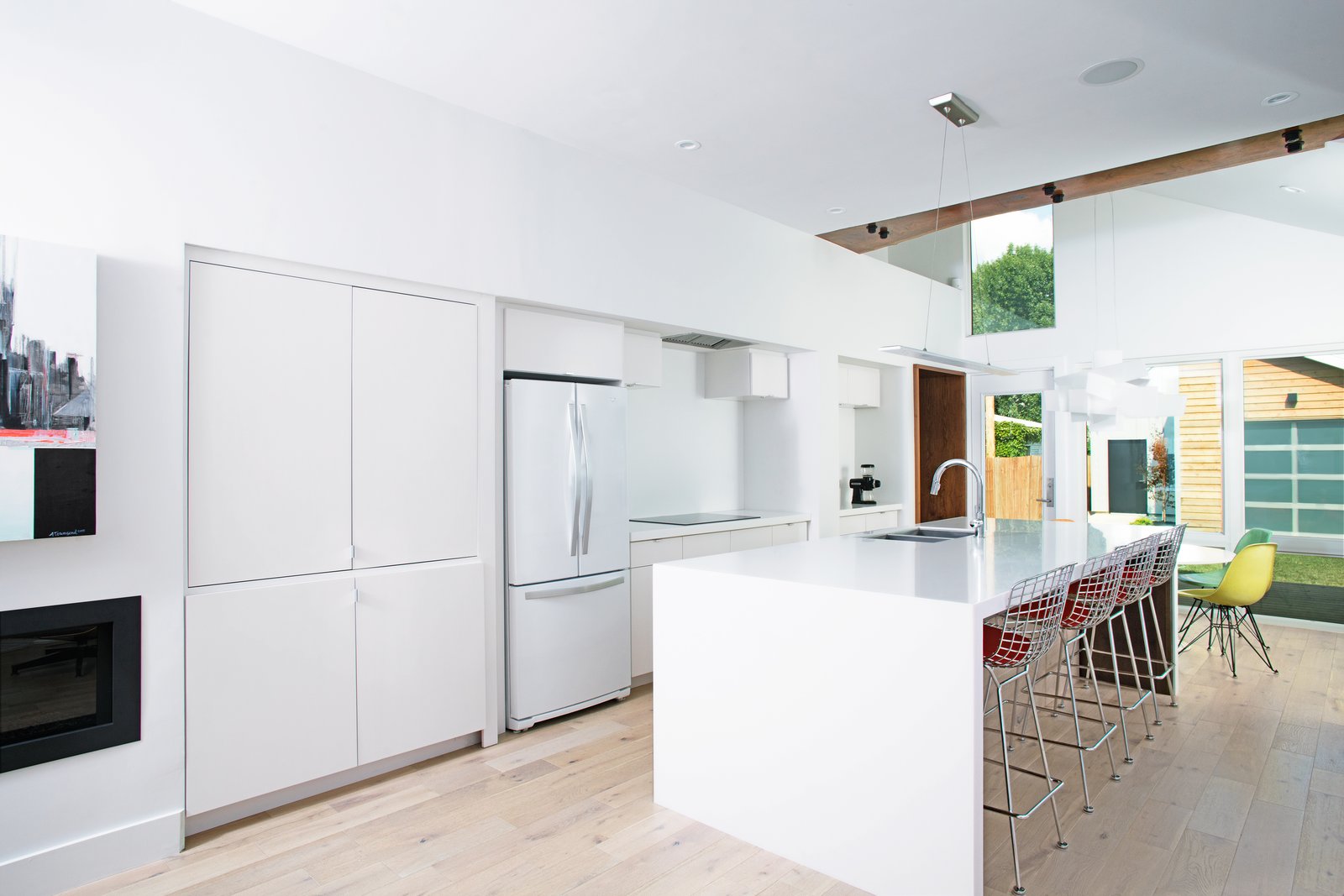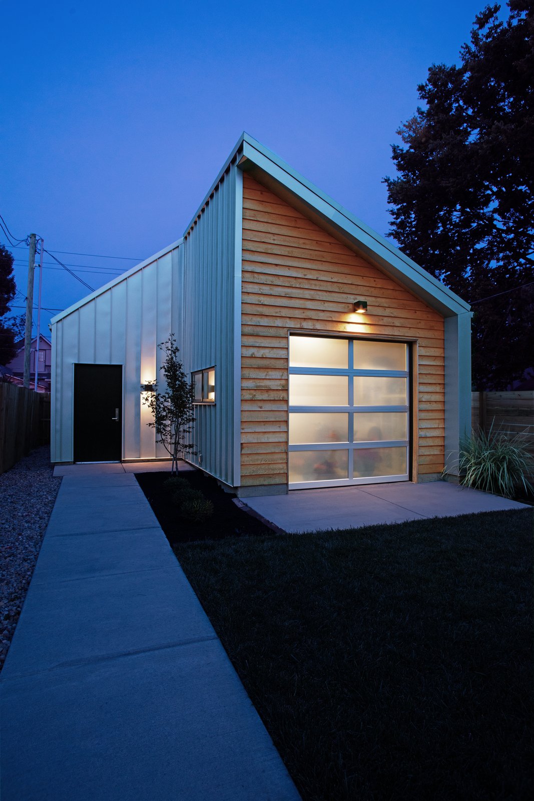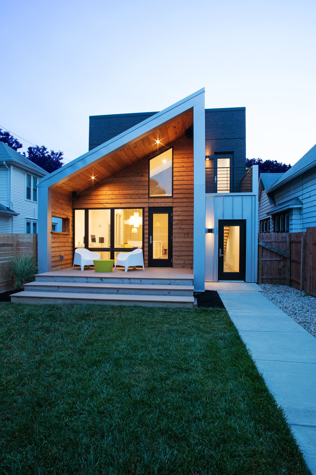 Further connecting the residence to the neighborhood, horizontal cedar cladding lends a familiar "face" to the single-story bookends. Vertical metal siding serves as another durable, low-maintenance facade, as the home is bordered by alleys on three sides.