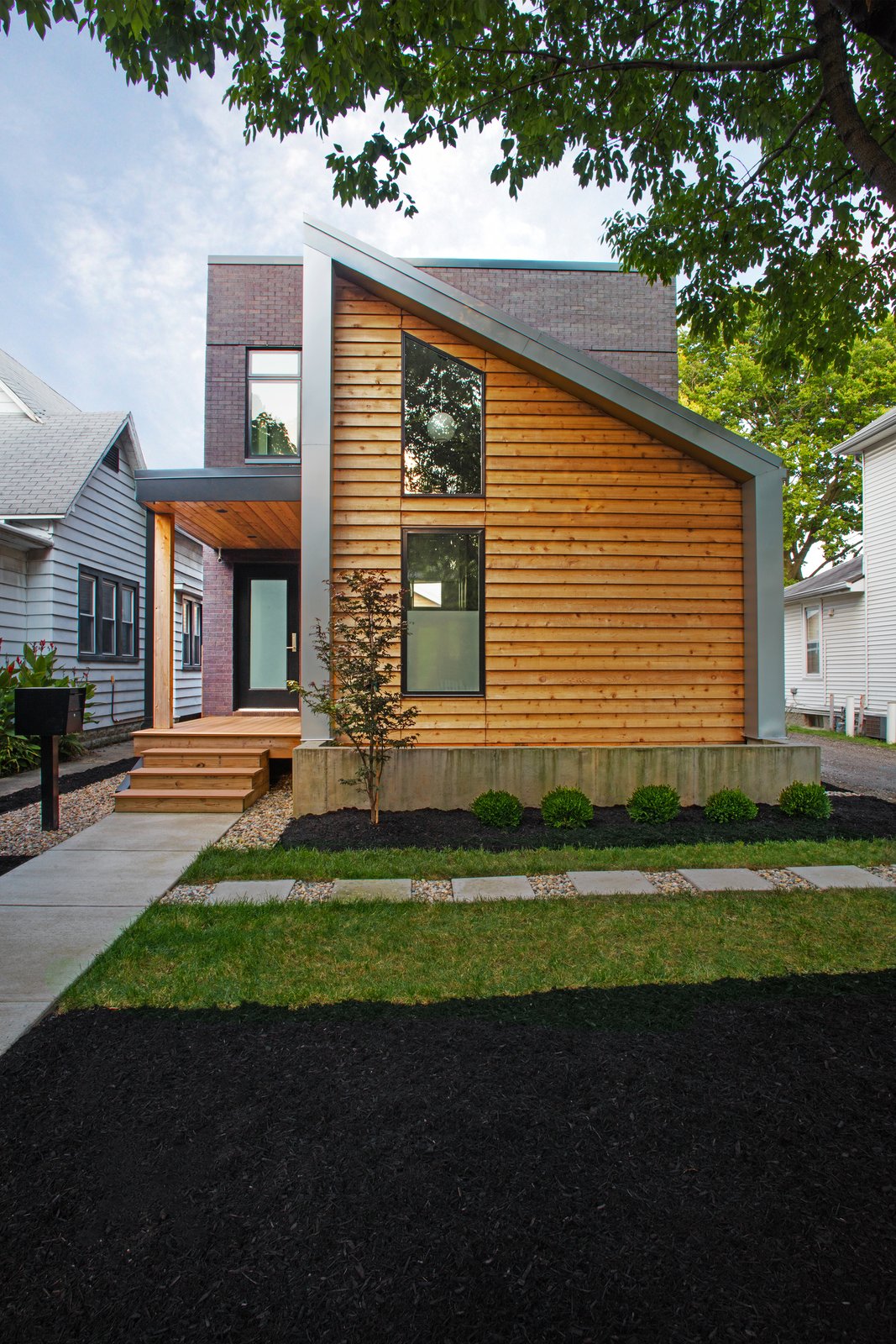 A two-story dwelling on an infill lot, the residence blends into the neighborhood with the help of cedar cladding, pitched roof lines, and a covered porch.